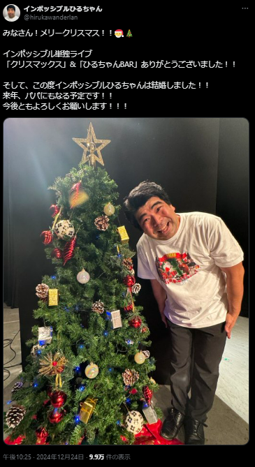 @hirukawanderlanみなさん!メリークリスマス!!🎅🎄 インポッシブル単独ライブ 「クリスマックス」&「ひるちゃんBAR」ありがとうございました!! そして、この度インポッシブルひるちゃんは結婚しました!! 来年、パパにもなる予定です!! 今後ともよろしくお願いします!!! pic.x.com/w7OrOGsCee